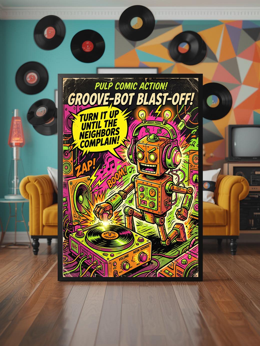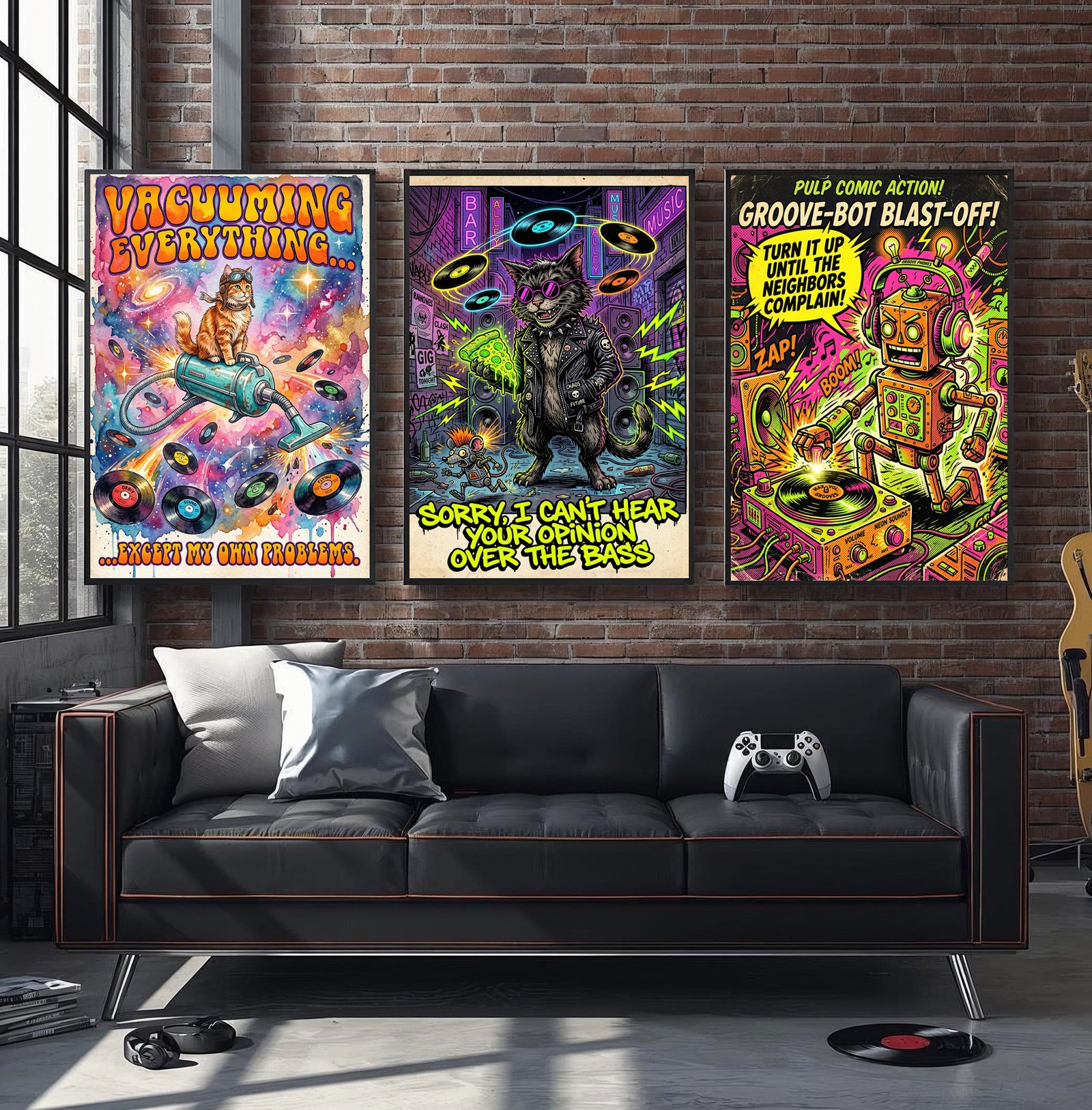 Funny Robot Wall Art Set of 3: Sorry I Can’t Hear, Existential Alarm & Vacuuming Everything Print, Quirky Retro Sci-Fi Poster Bundle