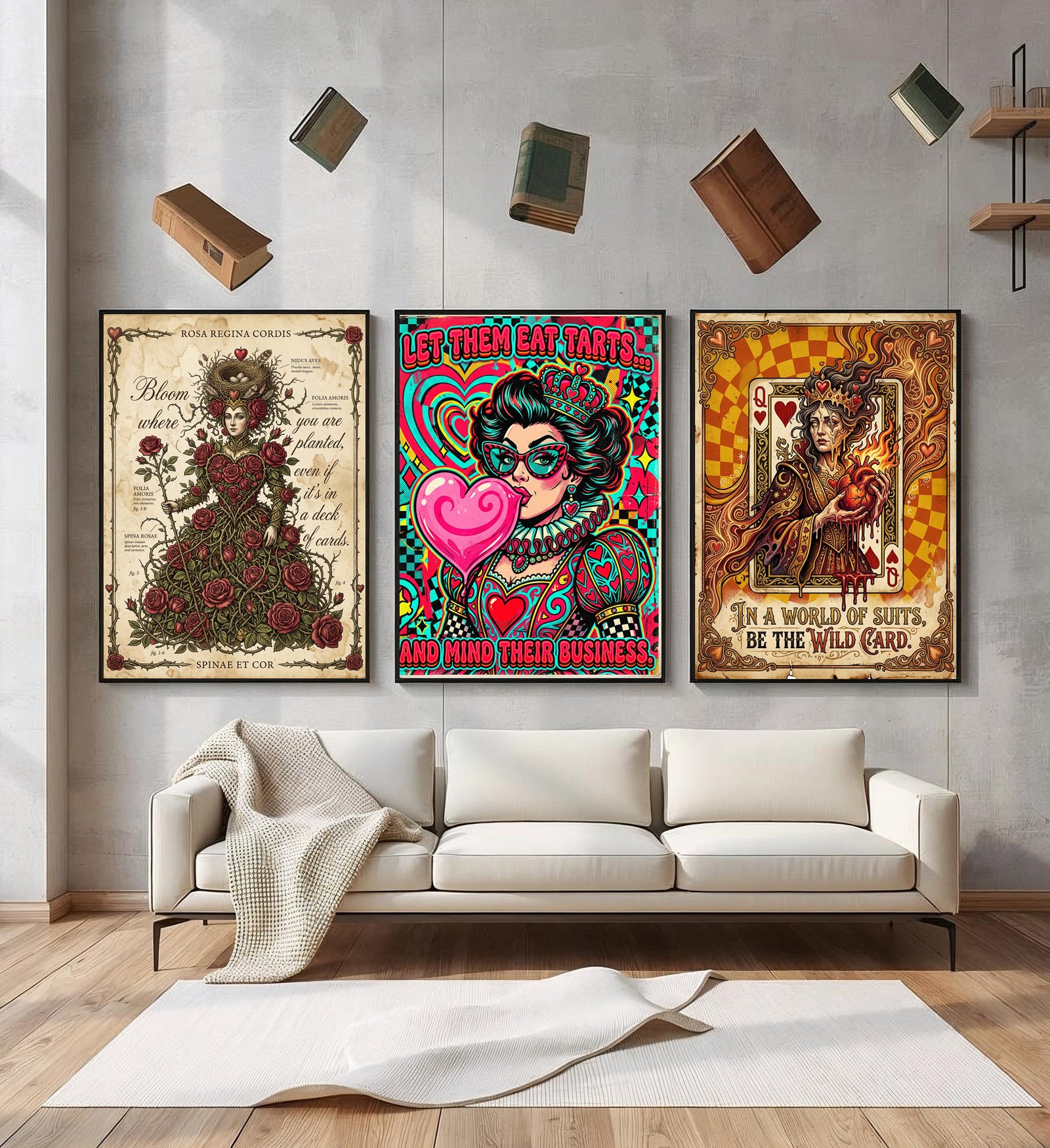 Are you tired of boring, basic wall art? Elevate your space with this exclusive set of 3 Wacky Queen of Hearts Digital Prints. Each poster combines vintage charm with a surreal, modern twist and a bold quote that refuses to be ignored.