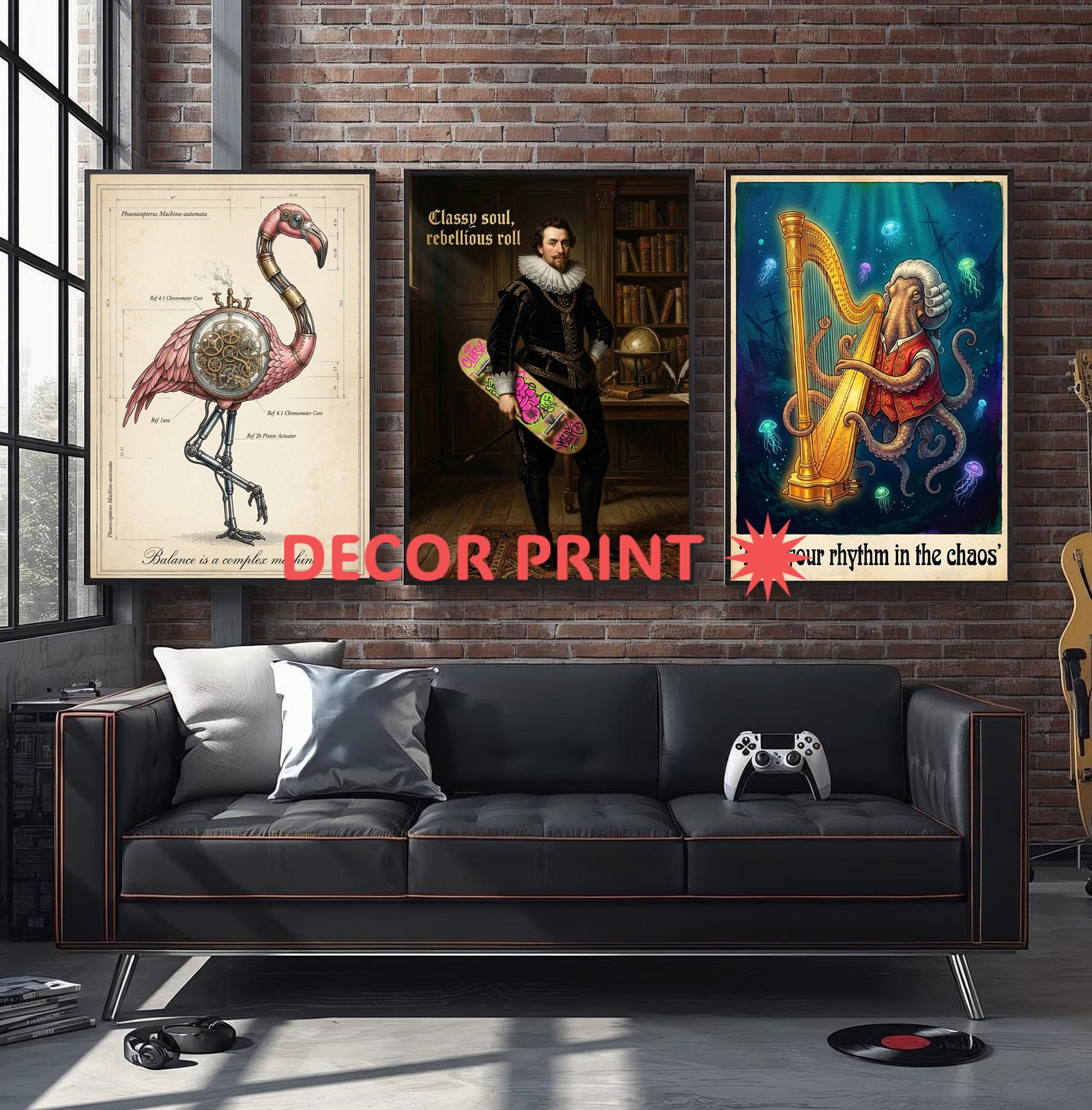 This unique set of 3 vintage-style posters, Realistic common octopus, Flamingo, Aristocrat from the 17th, Digital Download