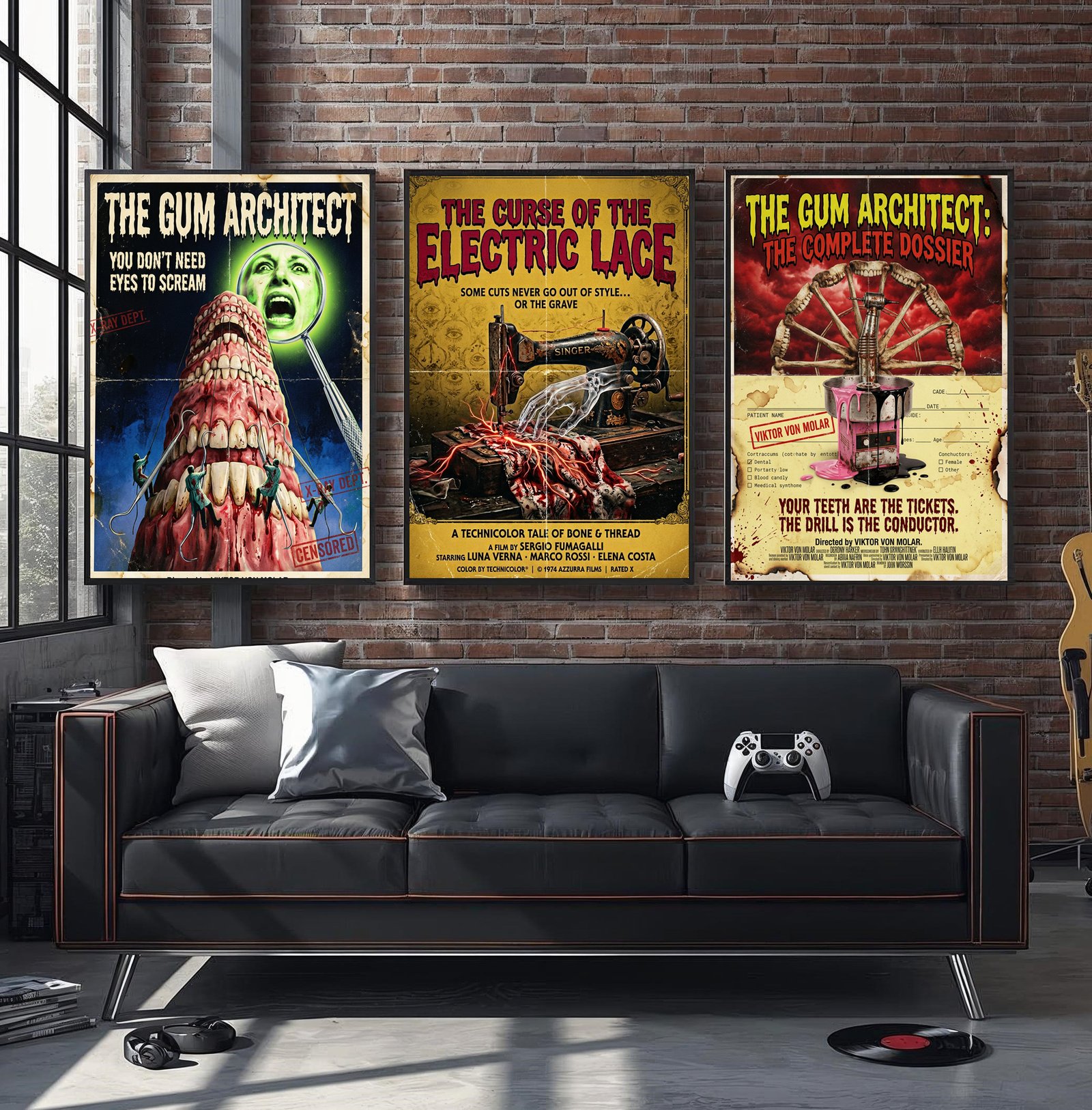 Surrealist Wall Art Set of 3: The Curse of the Electric Lace, The Gum Architect & Some Things Cannot Be Chewed Print, Quirky Avant-Garde Poster Bundle