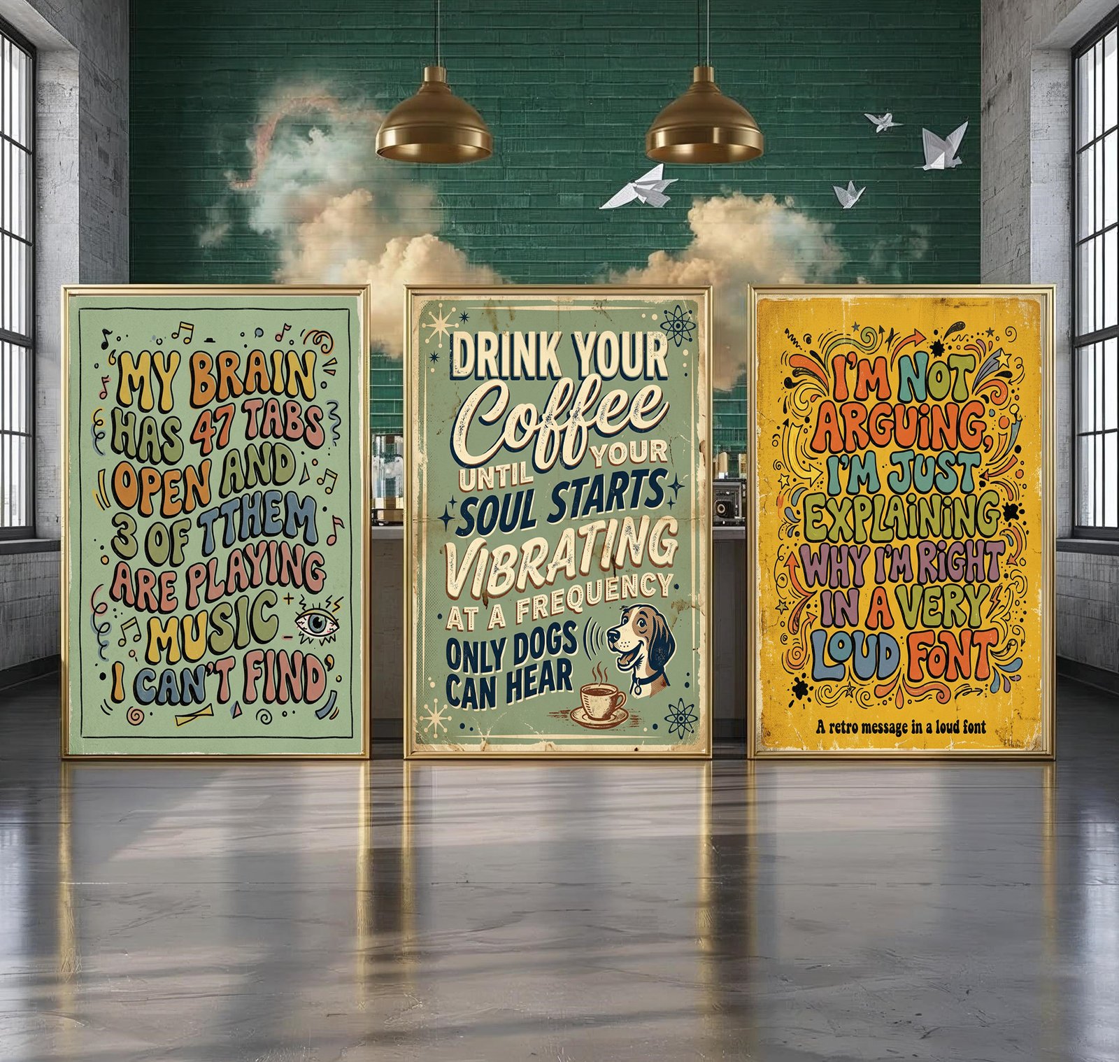 Stop decorating with boring art. This “Wacky Vintage Bundle” features quotes that are half-genius, half-insane, and 100% original. Each poster is designed with a vintage soul, featuring distressed textures and hand-drawn ink elements that look like they were sketched in a 1950s sketchbook.